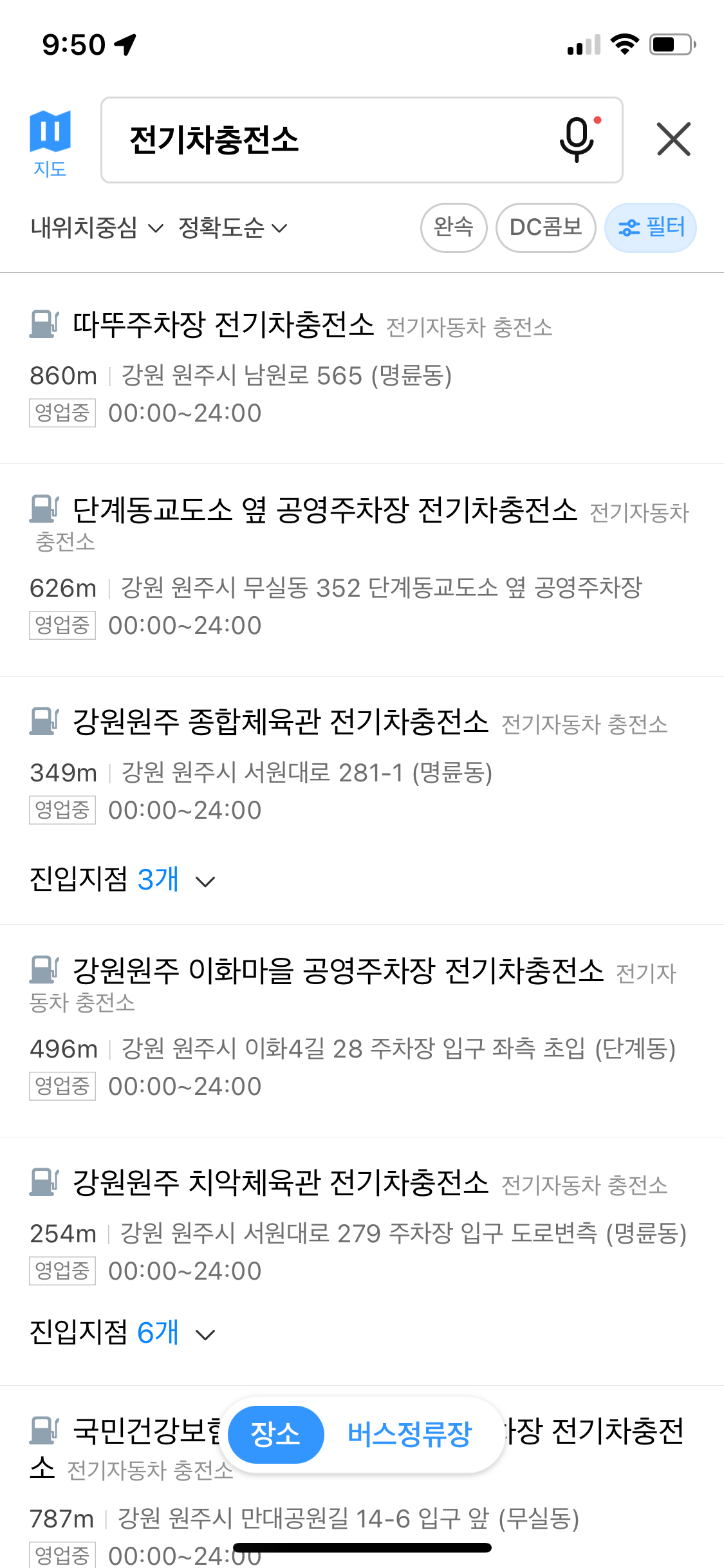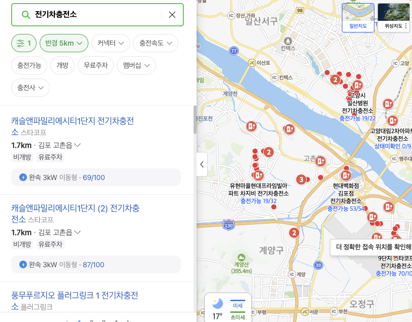 카카오맵을 이용하면 전기차 충전소 위치를 바로 찾을 수 있습니다. 카카오 맵을 실행한 후 위 주소 검색창 아래에 전기차 충전소 탭을 클릭하면 현재 위치한 장소에서 가장 가까운 전기차 충전소의 위치를 볼 수 있습니다.