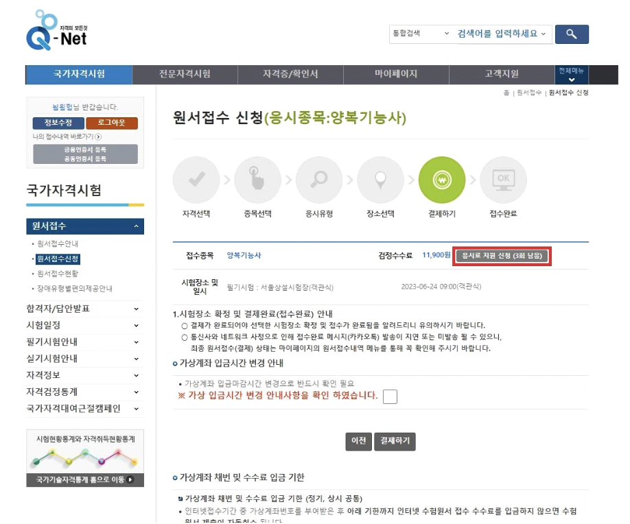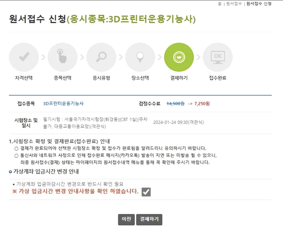3) 응시료 50% 지원 결과를 확인한 후 결제를 진행합니다. (신용카드, 계좌이체, 가상계좌 등 모든 결제수단은 가능합니다)