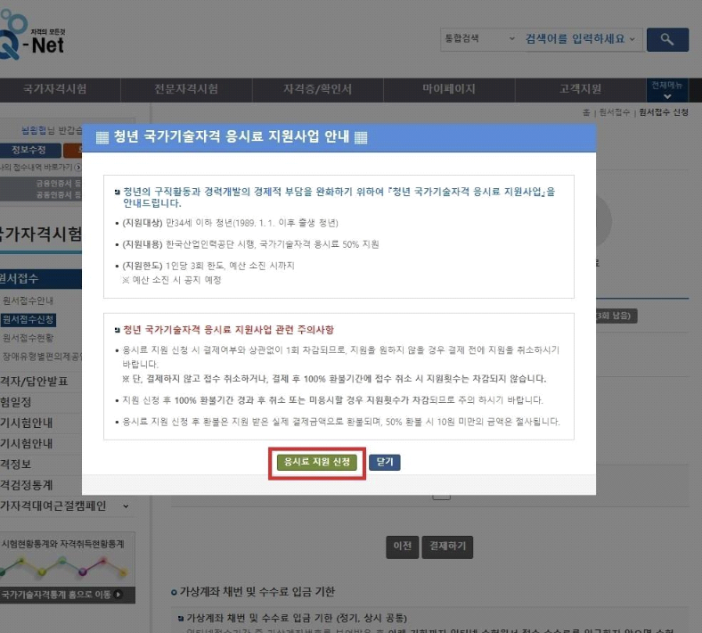 - 응시료 지원 신청 후에 결제하게 되면 지원 횟수가 차감됩니다! 지원을 원하지 않으면 반드시 결제를 취소하세요~