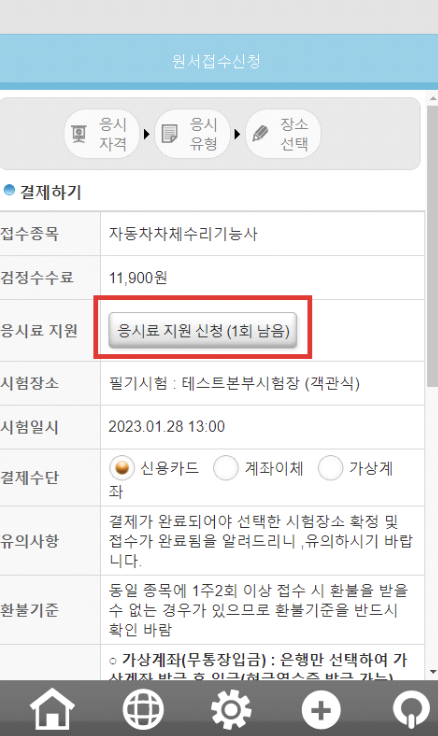 1) 최종 결제 전 응시료 지원 신청 여부를 선택할 수 있습니다.