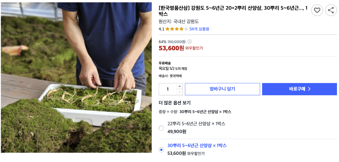 제품: 강원도 5~6년근 20+2 뿌리 산양삼, 30 뿌리 5~6년 근, 1박스