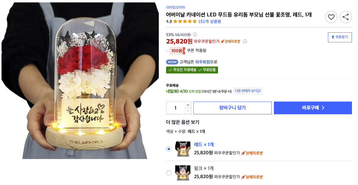 제품: 어버이날 카네이션 LED 무드등 유리돔 부모님 선물 꽃조명
