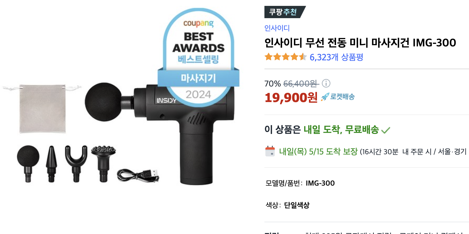 현재 별점 4.7점, 리뷰 6323개를 가진 인사이디 무선 전동 미니 마사지건 IMG-300! 지금 쿠팡에서 더 저렴하고 다양한 스트레칭 제품들을 확인해보세요.