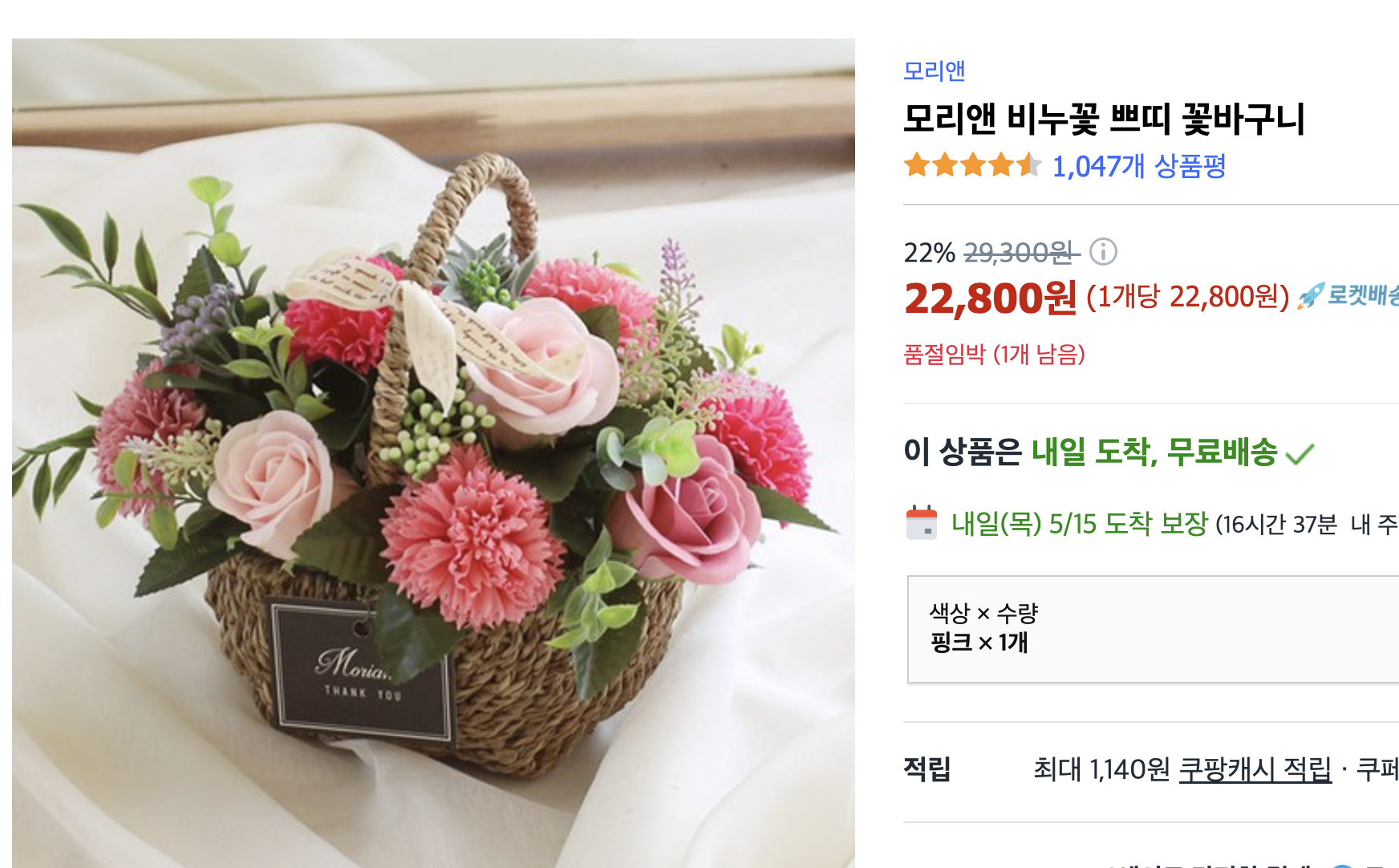 현재 별점 4.5점, 리뷰 1047개를 가진 모리앤 비누꽃 쁘띠 꽃바구니! 지금 쿠팡에서 더 저렴하고 다양한 조화 제품들을 확인해보세요.