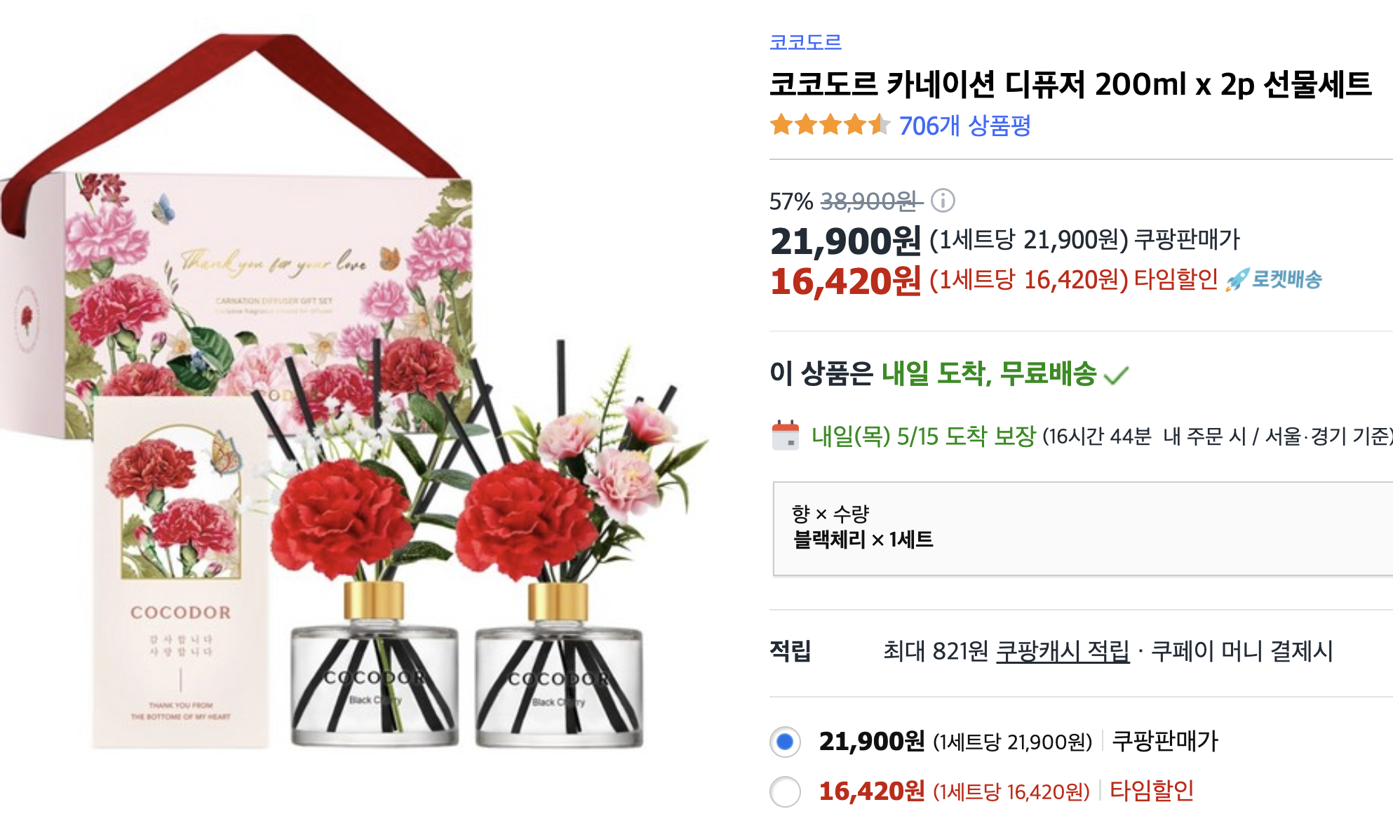 현재 별점 4.7점, 리뷰 706개를 가진 코코도르 카네이션 디퓨저 200ml x 2p 선물세트! 지금 쿠팡에서 더 저렴하고 다양한 디퓨저선물세트 제품들을 확인해보세요.
