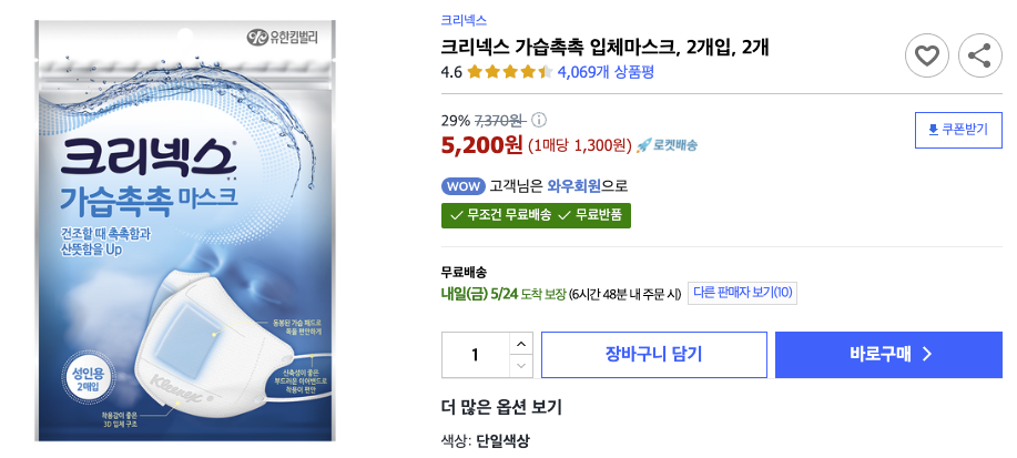 품목 : 크리넥스 가습촉촉 입체마스크, 2개입, 2개