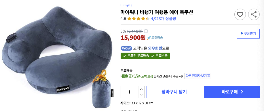 1. 마이워니 비행기 여행용 에어 목쿠션