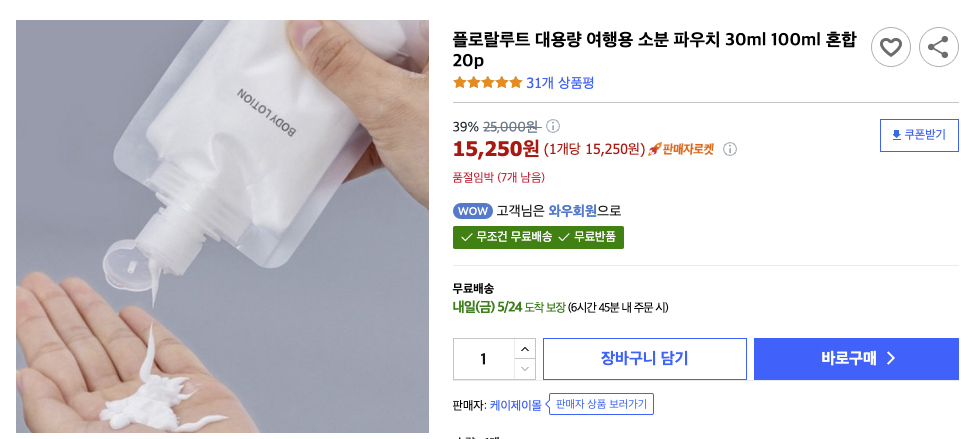 품목 : 플로랄루트 대용량 여행용 소분 파우치 30ml 100ml 혼합 20p